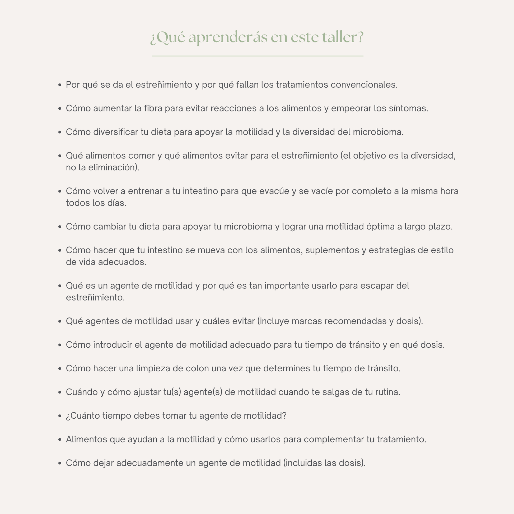 En este taller te enseño el enfoque integral y práctico para dejar atrás el estreñimiento crónico y recuperar un tránsito intestinal natural y sin miedo a depender de laxantes.