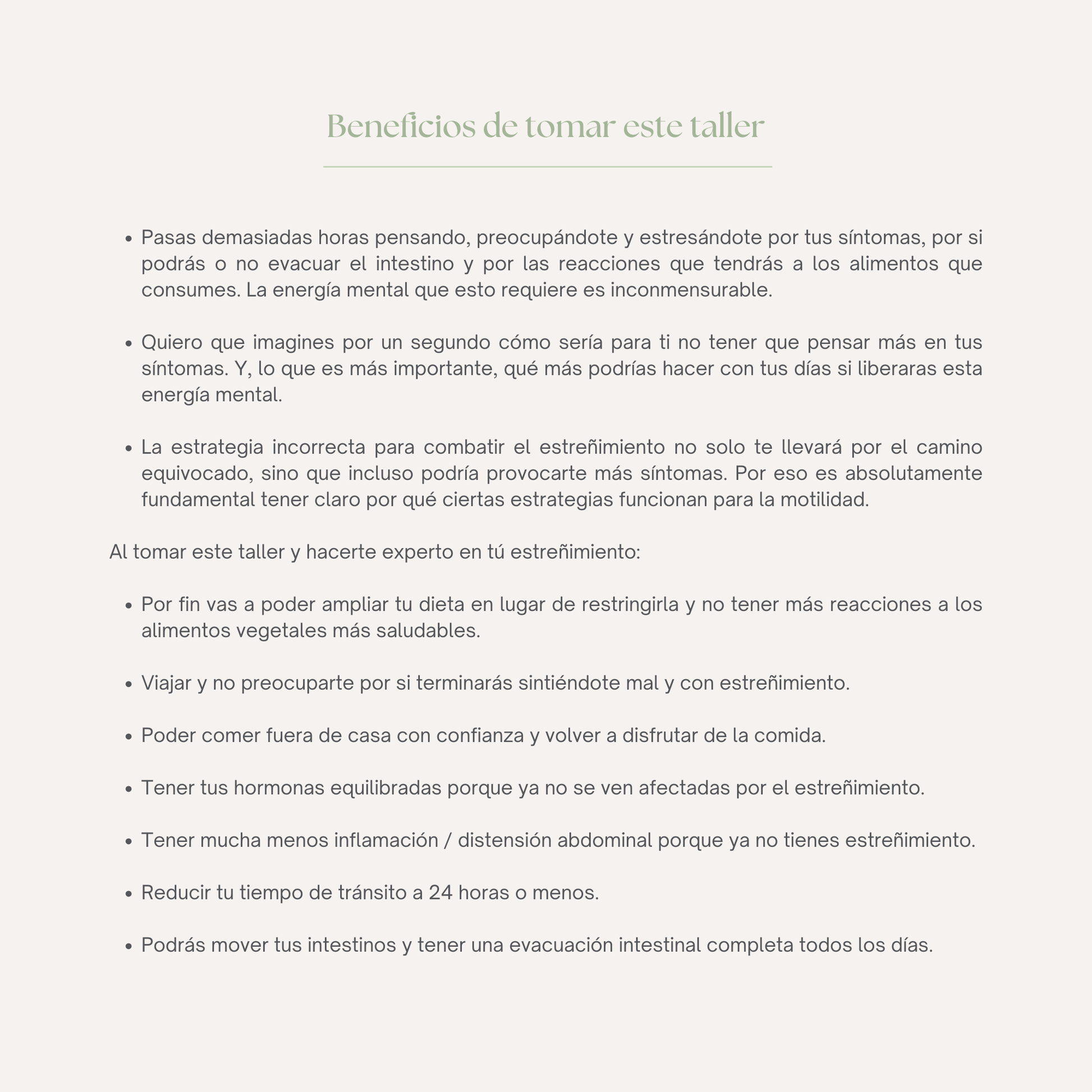 Este taller es para ti si llevas tiempo luchando con el estreñimiento, has probado de todo y nada te funciona, y quieres aprender a resolverlo de manera integral, sostenible y sin miedo a la comida o a los laxantes.